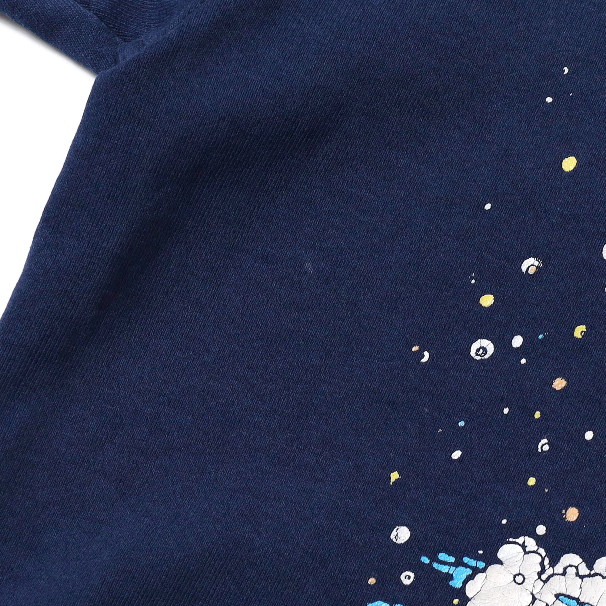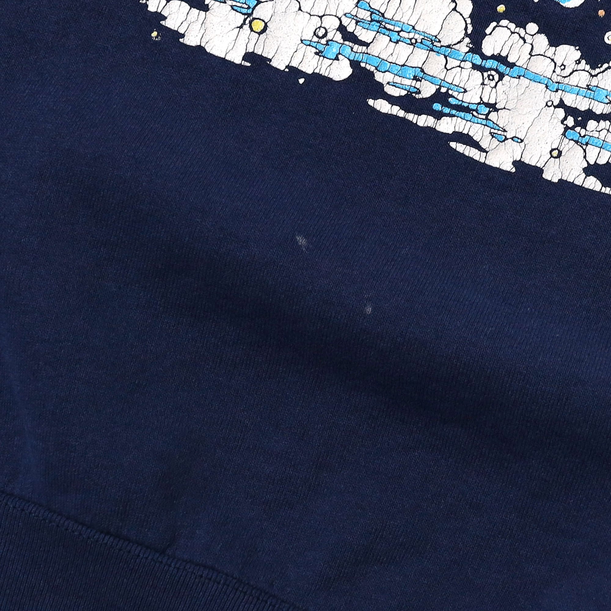 プリント割れ、前身頃に小さな傷(画像5枚目)、左袖先に若干のダメージ(画像6枚目)、前身頃(画像7~9枚目)と右袖付け根(画像10枚目)、左袖後ろ(画像11枚目)に脱色のような箇所あり。