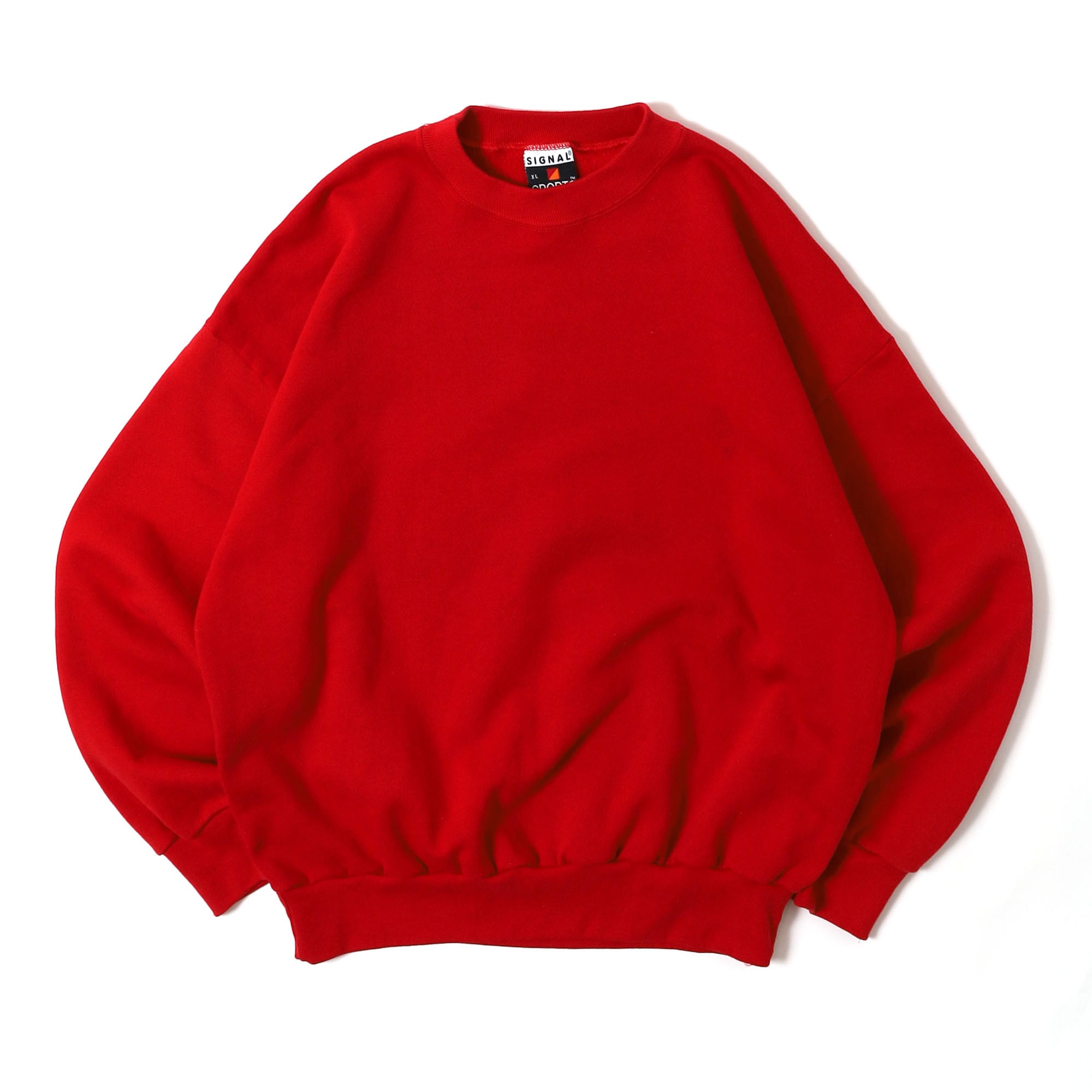 無地のシンプルなスウェットです。赤は注目度の高いカラーですし、コーディネートのアクセントになってくれるかと思います。古いスウェットらしいボクシーなシルエットですが、小さすぎず大きすぎず、とても洒落たバランスで着ていただけます。
