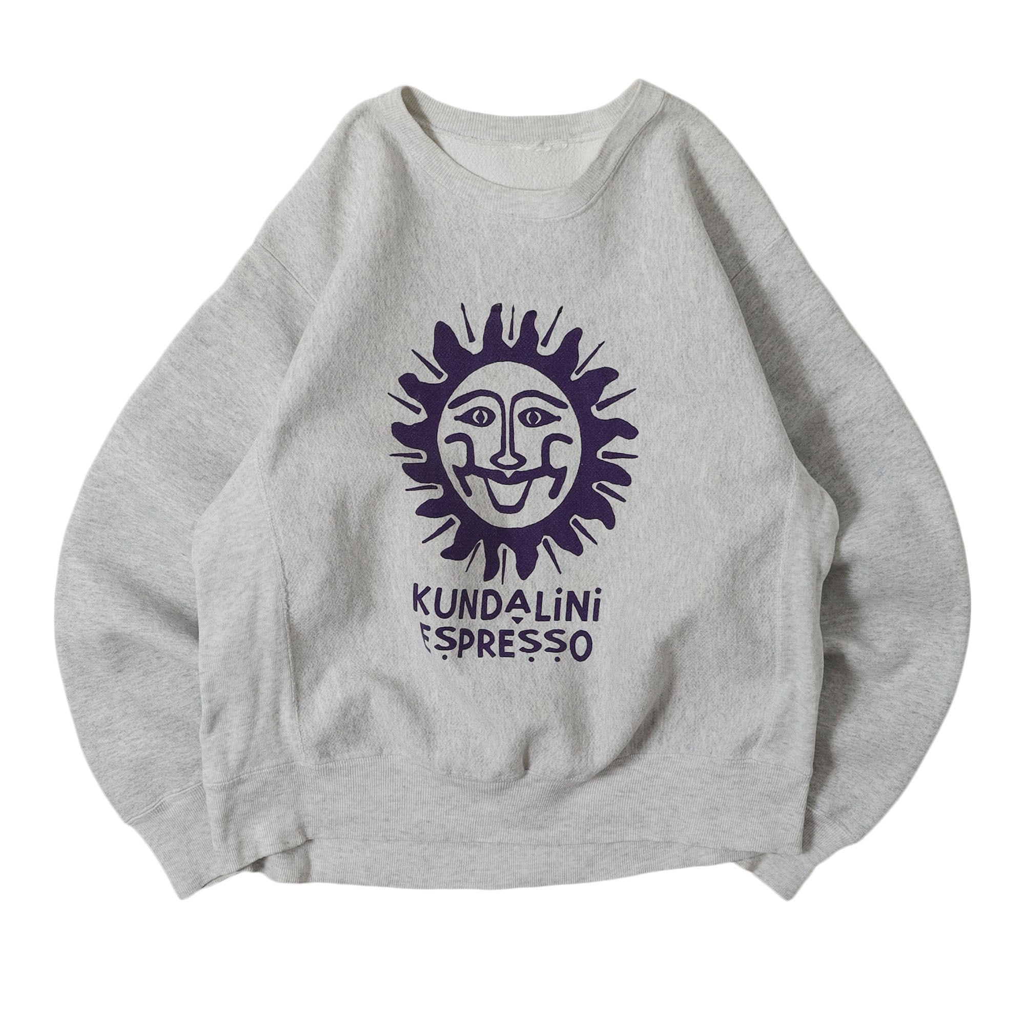 KUNDALINI ESPRESSOという店なのかメーカーなのか、詳しくは不明ですがそういった類のスウェットです。KUNDALINIというのはサンスクリット語の生命の根本的なエネルギーを意味する言葉で、バックにはその言葉の意味が辞書そのままのようなバランスでプリントされています。フロントの大きなロゴも雰囲気やフォントのデザインが良く、グレーボディにパープルのカラーリングも抜群です。