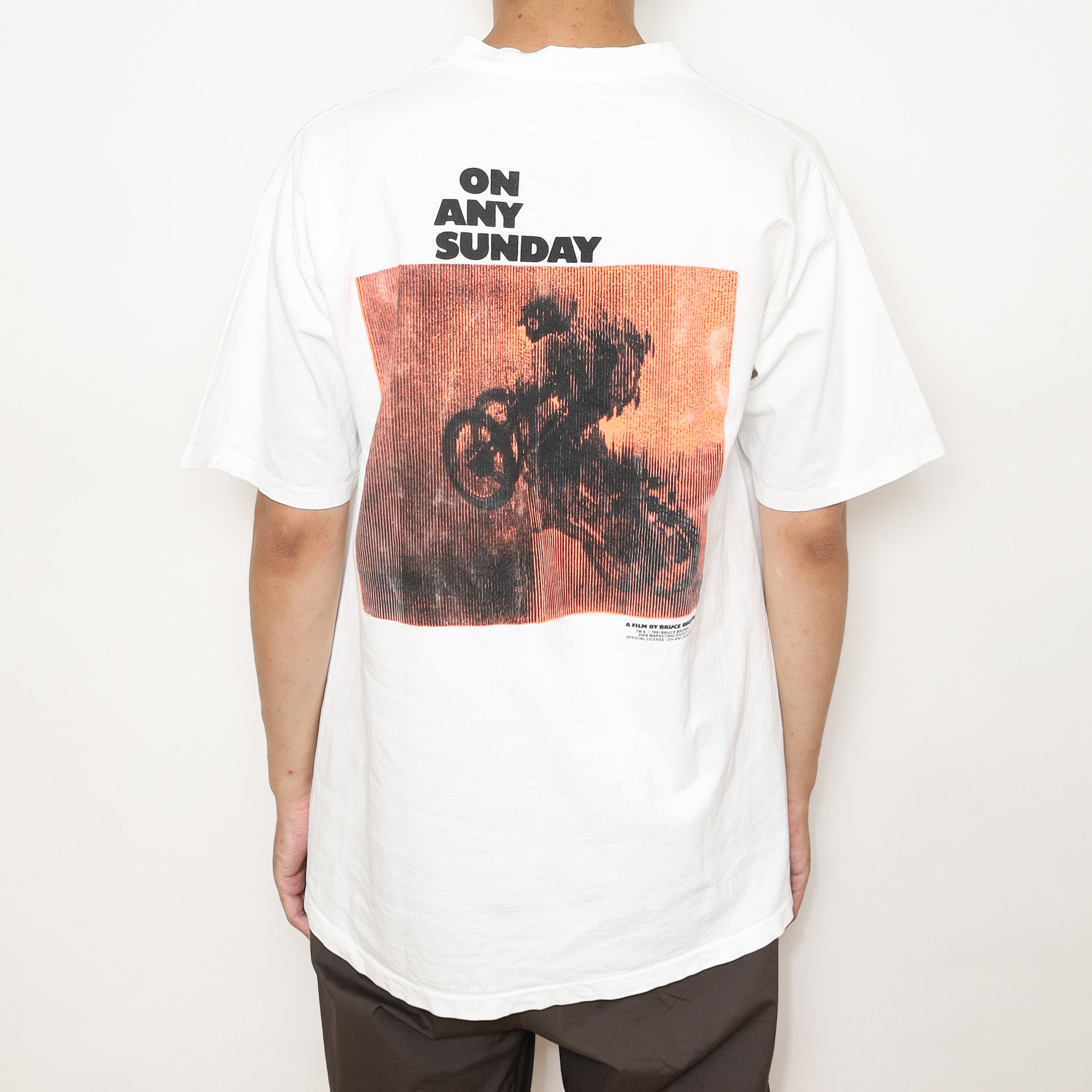 アメリカの各地で毎週日曜日に開催されているバイクレースや参加選手の日常を映したドキュメンタリー映画 "ON ANY SUNDAY" のライセンスTシャツ。監督・脚本を務めたのは "The Endless Summer" でおなじみの "Bruce Brown" 。プリントのデザインやサイズ感がとても今っぽく、かっこいい1枚です。