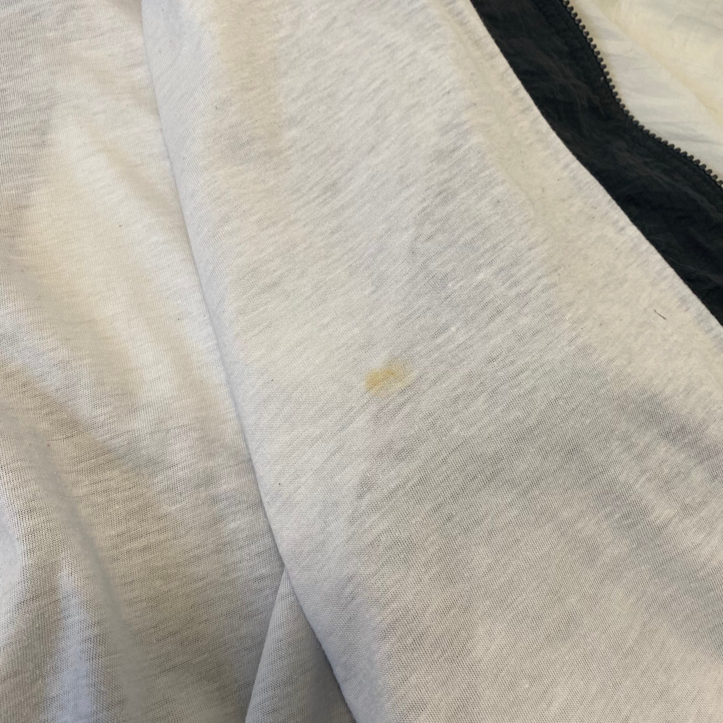 ロゴ刺繍の上に汚れ(写真6枚目)、裏側にシミ(写真7,8枚目)あり。